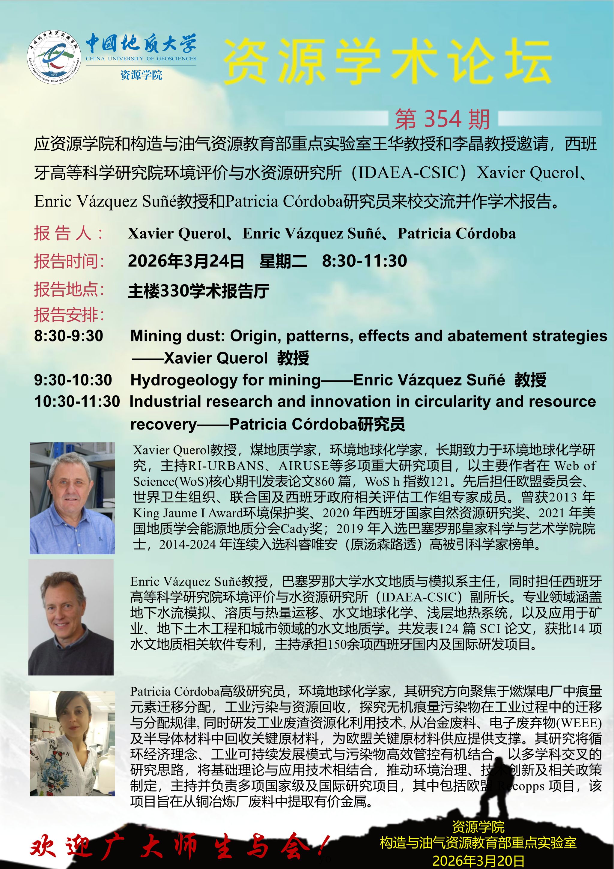 【3月24日】第354期bevictor伟德官网,韦德官方网站:Xavier Querol、Enric Vázquez Suñé、Patricia Córdoba学术报告