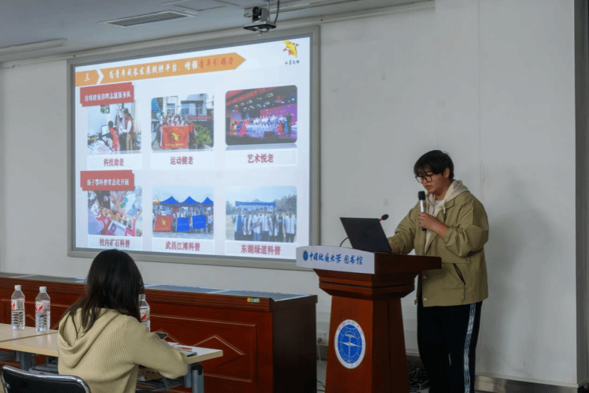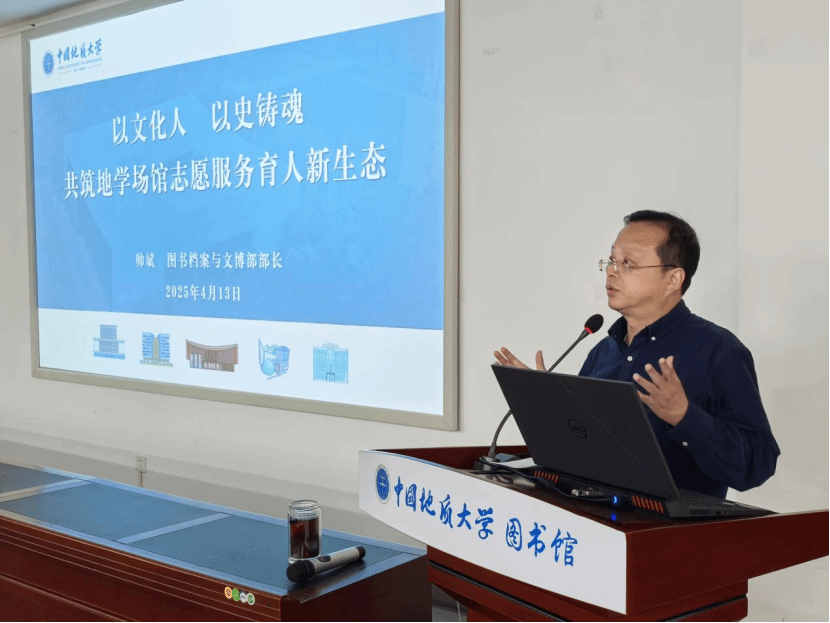 帅斌部长以《以文化人 以史铸魂 共筑地学场馆志愿服务育人新生态》为题作主旨分享。他结合习近平总书记重要讲话精神,深入剖析了新时代中国志愿者精神的内涵,他表示志愿服务是高校培育和弘扬社会主义核心价值观、落实立德树人根本任务的重要途径,是新时代“大思政课”的鲜活载体。他通过中西方政治制度差异、中国制度的优势生动阐述了志愿精神的内在逻辑,他指出大学生要通过认知、情感和行动有效地将志愿精神内化成稳定的公益德性和志愿伦理。他介绍了图档文博部“一部四馆”的基本情况和各具特色的志愿服务体系,他表示“四馆”将守正创新,携手志愿者打造场馆志愿服标杆,夯实场馆育人实效,推动“四馆”在新时代文明实践中心建设中发挥更加重要的作用。