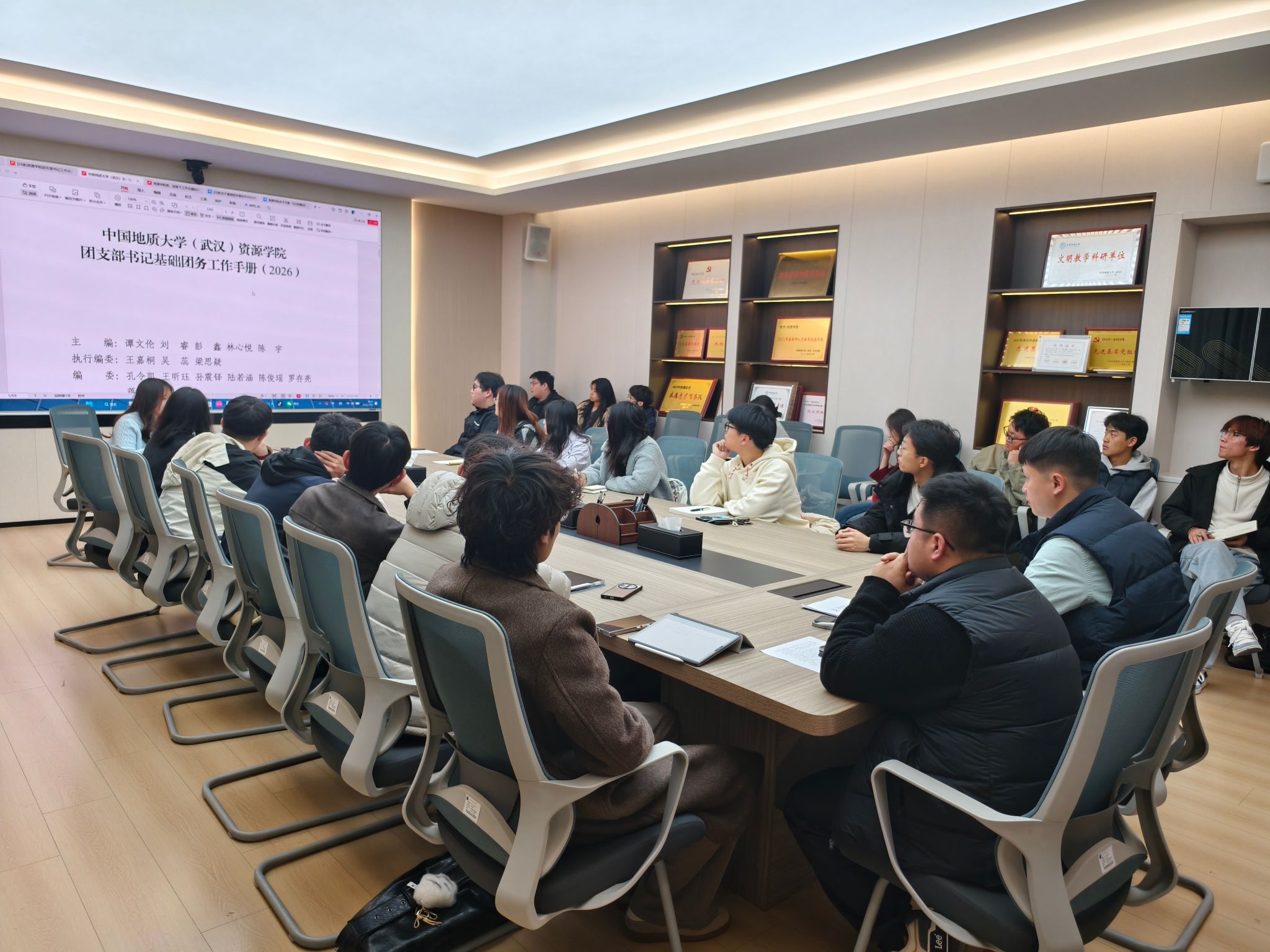 为进一步强化基层团组织建设,增强基础团务工作规范性,提升团支部书记履职能力,学院团委组织部部长吴蕊重点解读了《中国地质大学(武汉)bevictor伟德官网团支部书记基础团务工作手册(2026)》(以下简称“《手册》”)。她讲解了《手册》内容的“团的基本知识、基础团务工作、团支部书记要知晓的特色团学活动、bevictor伟德官网特色主题团日活动”等四个章节的内容,并号召全体团支部书记增强政治意识,强化工作基本规范,带领团员青年共同夯实支部基本建设。