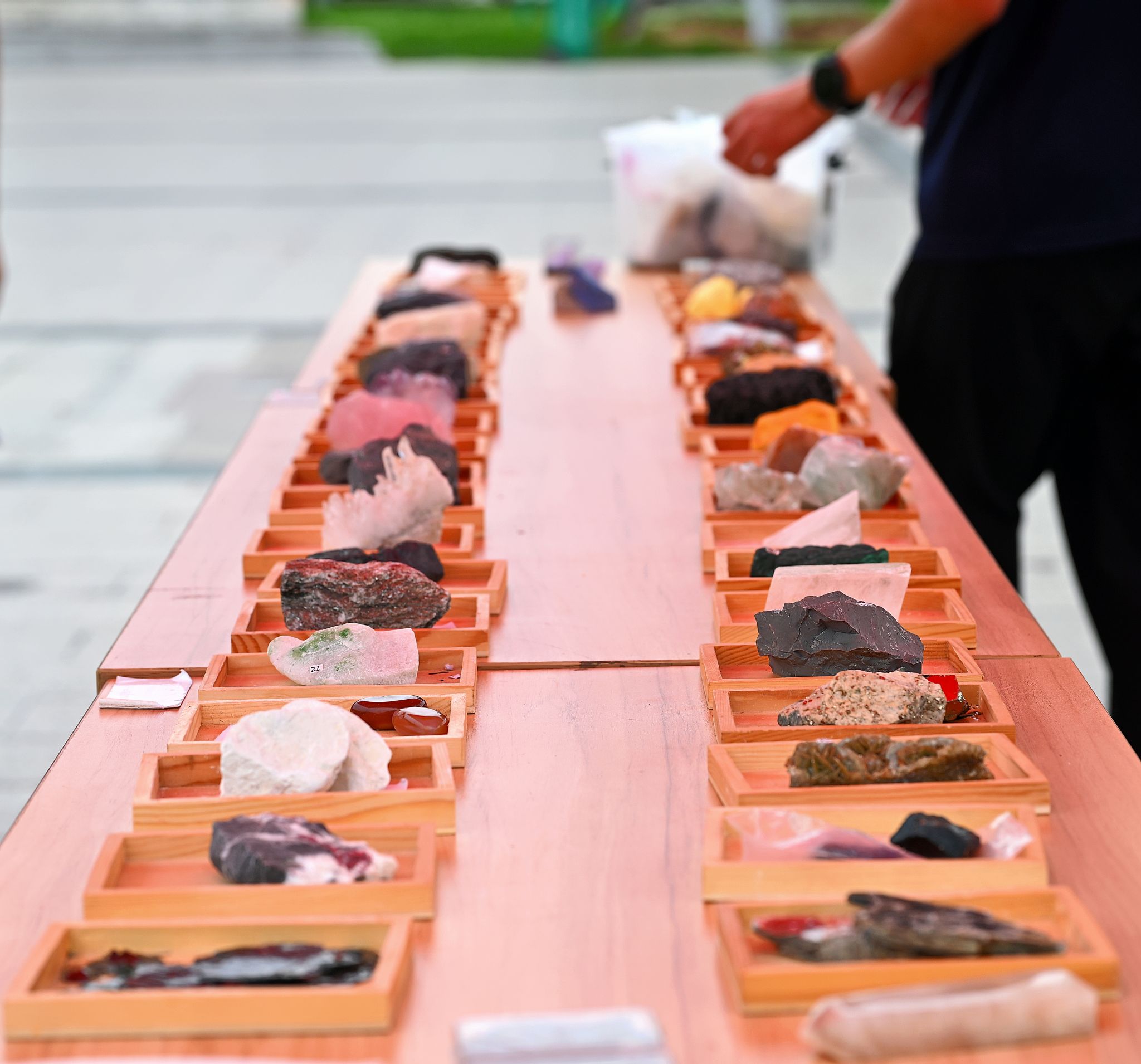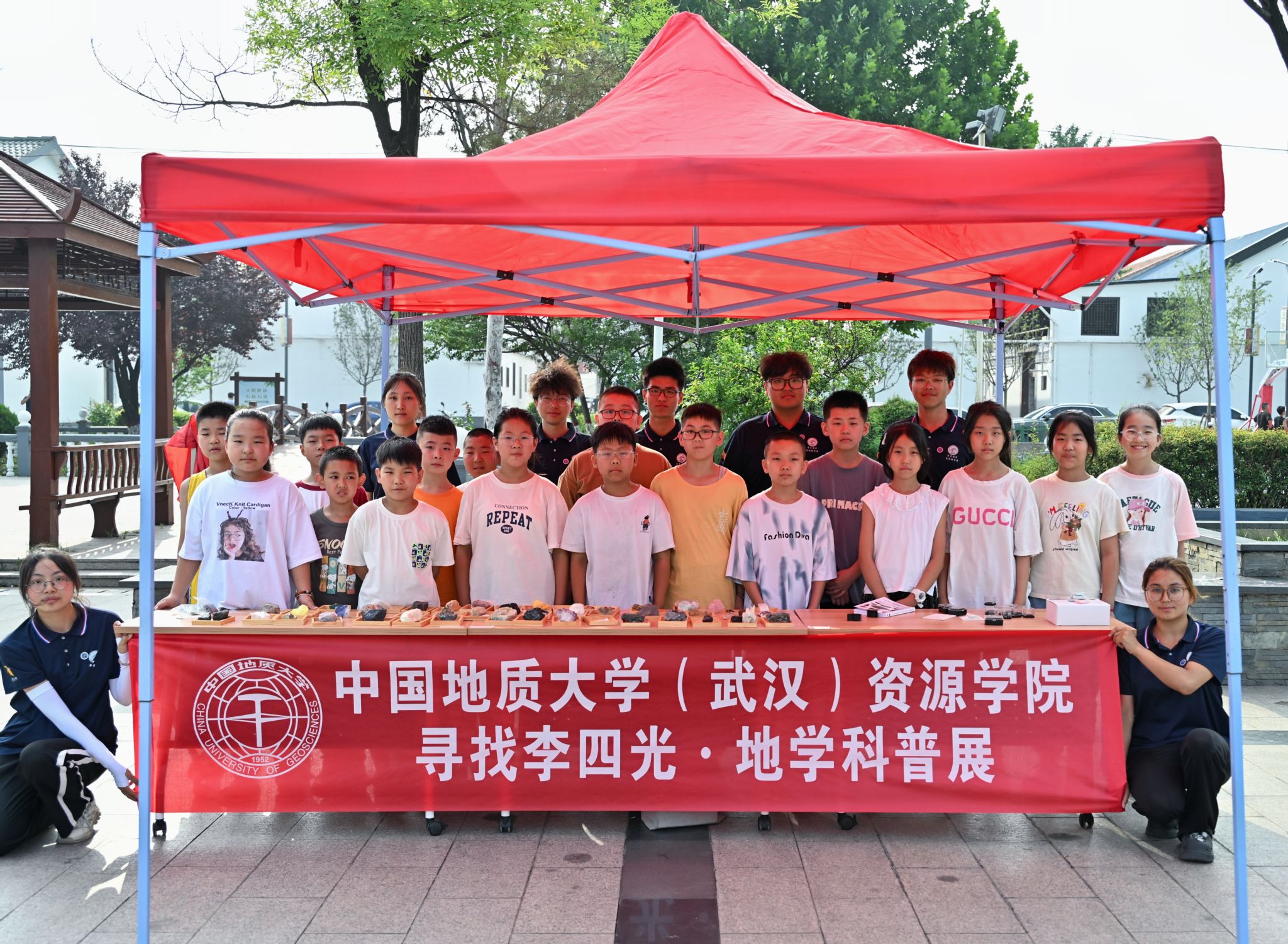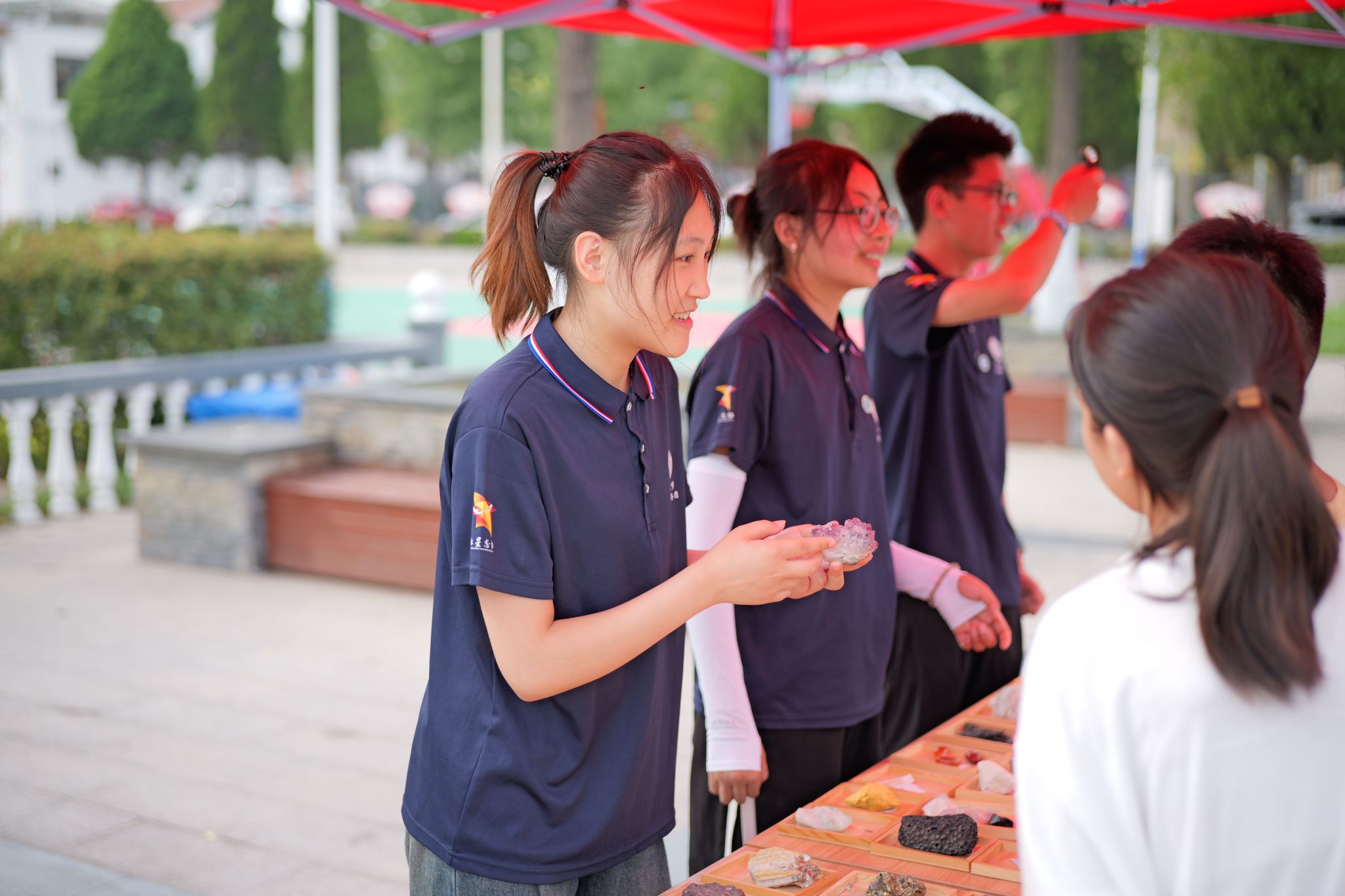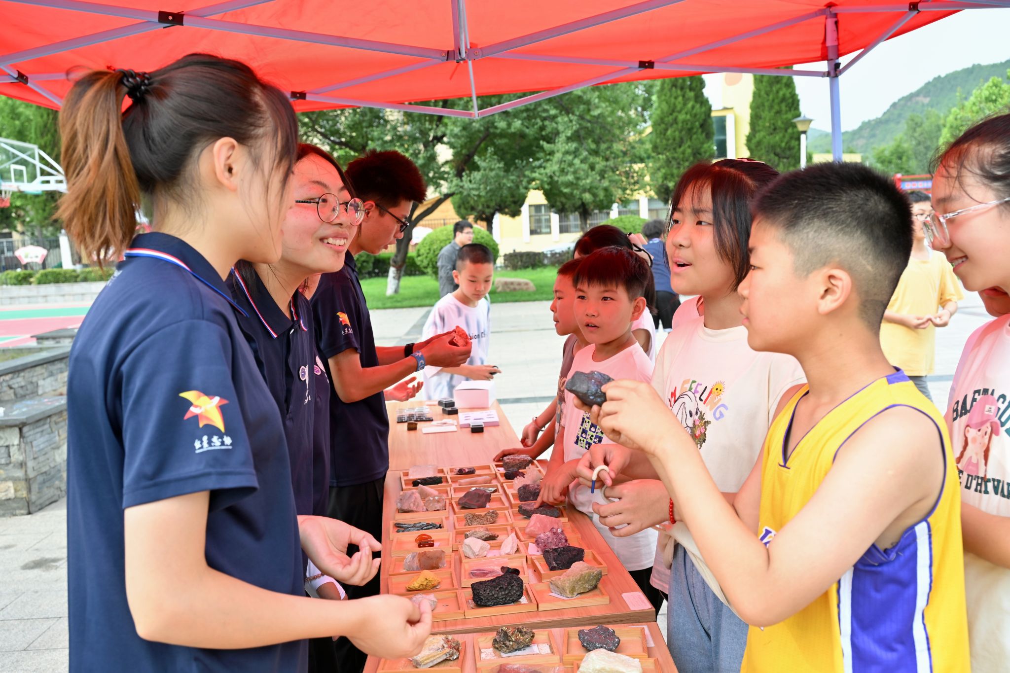 活动现场,各式各样的精美矿石标本呈现在眼前,吸引了附近社区的居民和小朋友们前来观看,科普摊位被大小朋友们团团围住。