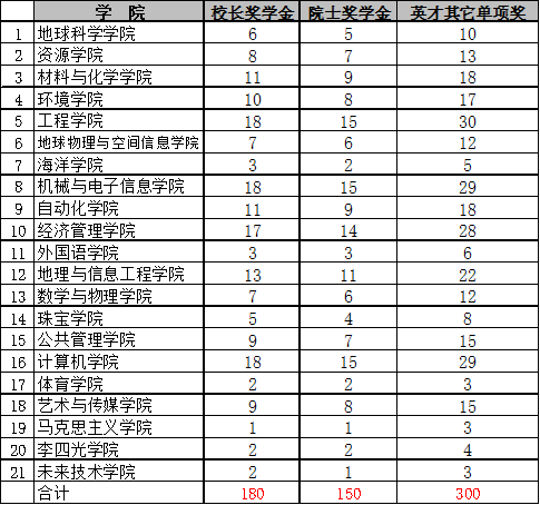 “地大英才奖学金”(“李四光英才奖”、“少数民族学生奖”、“创业之星奖”除外)采取等额评选办法,各学院具体名额见下表。