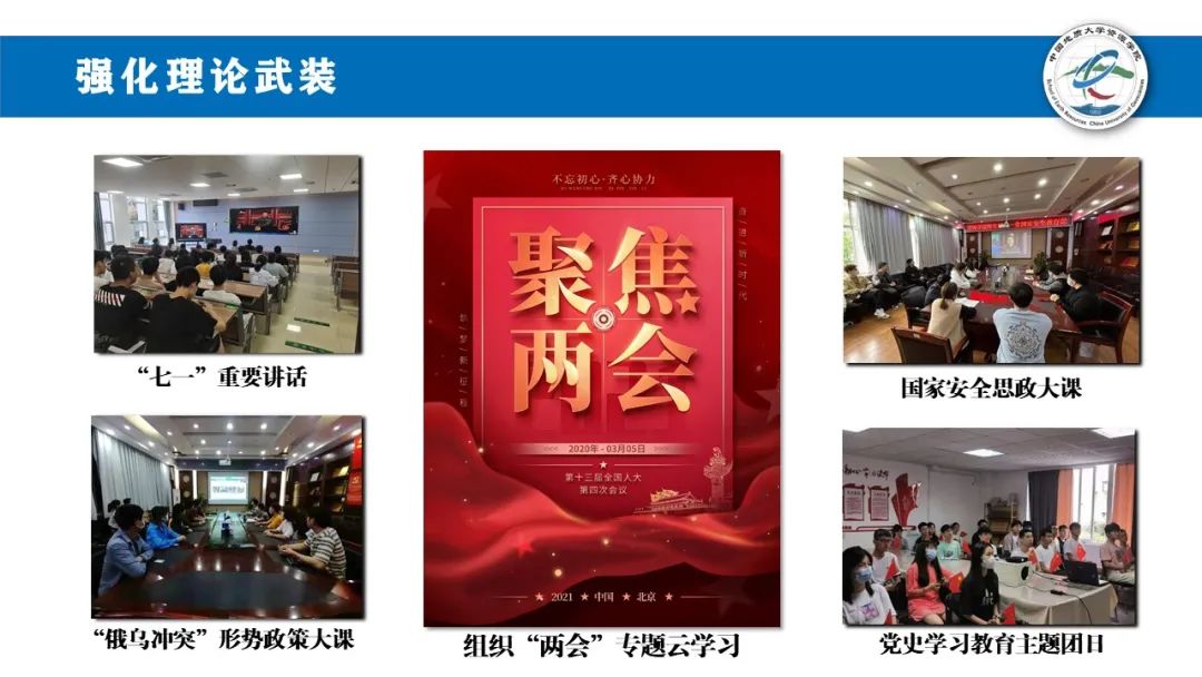 强化理论武装。依托学院青马班,以党史教育为主线,开展理论学习。定期例会实现学习常态化;共学“7·1”讲话、两会报告,共上俄乌冲突、国家安全思政大课。