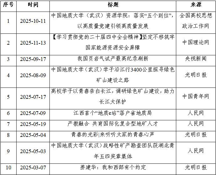 学院党委坚持以习近平新时代中国特色社会主义思想为指导,扎实开展深入贯彻中央八项规定精神学习教育。构建“1543”党建工作体系。试点建设教师“领航工作站”。学院党委被推荐参评第五批“全国党建工作标杆院系”。赴江西省地质局第一地质大队、江汉油田勘探开发研究院开展党建联建共创,共建党建联建共创示范基地。获批2025年湖北省党建研究课题立项1项。资源科学与工程系党支部、石油地质系党支部、矿床学研究生党支部和2位入选“研究生党员标兵”的学生顺利通过学校第二批党建工作“样板支部”“研究生党员标兵”项目验收。沉积储层研究生党支部入选学校第三批党建工作“研究生样板支部”培育名单。1位学生入选“研究生党员标兵”培育名单。