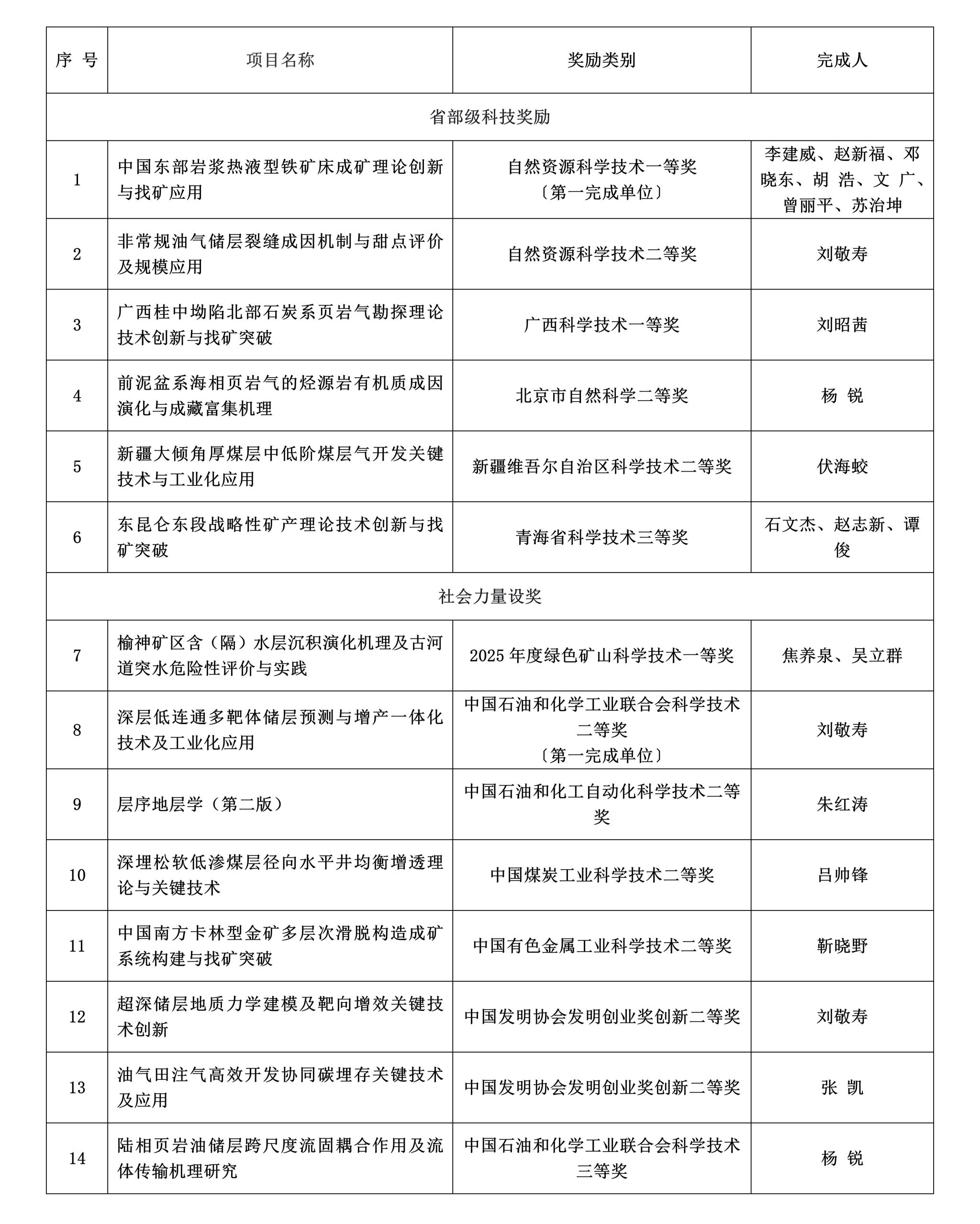 (通讯员 徐 佳)在学校“十四五”规划实施的引导支持下,bevictor伟德官网在油气资源勘查开发、战略矿产找矿突破、绿色矿山建设等领域取得标志性成果,2025年度共斩获14项重要科技成果奖,涵盖省部级科技奖励与社会力量设奖,bevictor伟德官网作为第一完成单位获自然资源科技进步一等奖1项、中国石油和化学工业联合会科技进步二等奖1项;作为参与单位获一等奖2项、二等奖8项、三等奖2项。