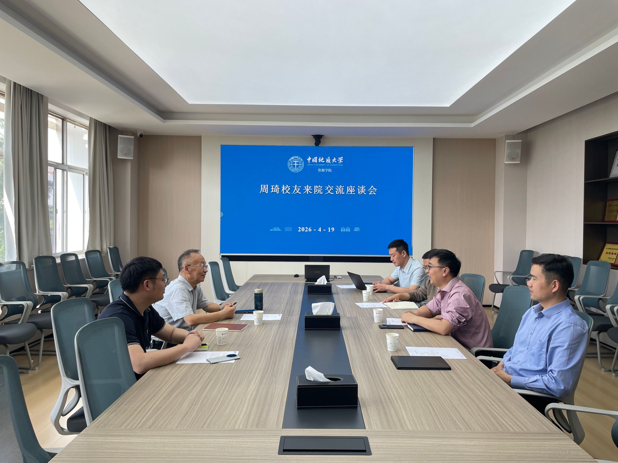 4月19日,贵州省地质矿产勘查开发局首席科学家周琦、高级工程师刘雨一行来院交流,学院党委书记汪再奇、副院长李占轲、资源科学与工程系党支部书记付乐兵、资源科学与工程系副主任靳晓野等参加座谈,汪再奇主持会议。