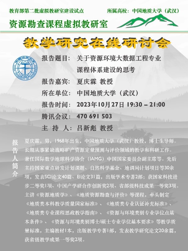 各基层教学组织都开展了教学建设主题活动,其中18个课程组和1个实验教学中心全年组织开展了44场形式多样的教研活动。同时,资源勘查课程教育部虚拟教研室开展了4次覆盖全国相关高校的线上教研活动,有力促进了资源勘查工程专业课堂教学模式创新和教学质量提升。